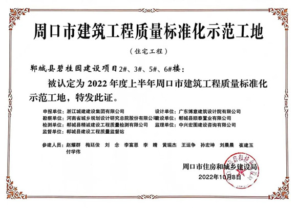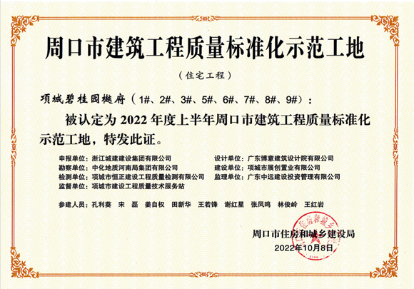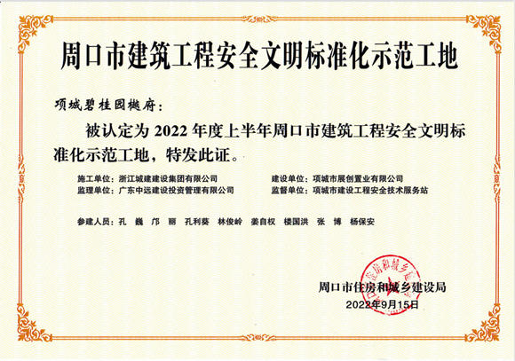 近日,浙江城建第三工程公司河南區(qū)域碧桂園項目喜訊頻傳:鄲城碧桂園項目獲評2022年度上半年周口市建筑工程質量標準化示范工地;項城碧桂園樾府項目獲評2022年度上半年周口市建筑工程安全文明標準化示范工地、周口市建筑工程質量標準化示范工地。