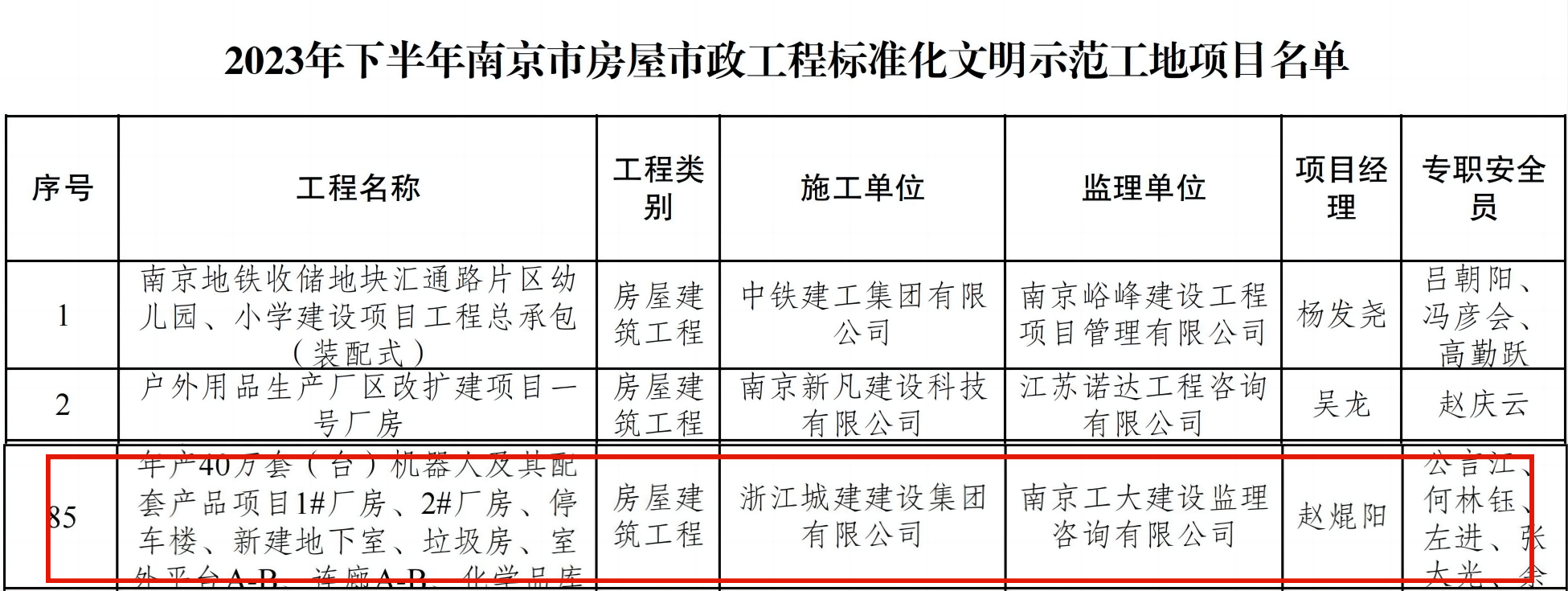 近日,南京市城鄉(xiāng)建設(shè)委員會(huì)公布了“2023年下半年南京市房屋市政工程標(biāo)準(zhǔn)化文明示范工地項(xiàng)目名單”。浙江城建一公司承建的南京匯川技術(shù)年產(chǎn)40萬(wàn)套(臺(tái))機(jī)器人及其配套產(chǎn)品項(xiàng)目(以下簡(jiǎn)稱南京匯川項(xiàng)目)位列其中。