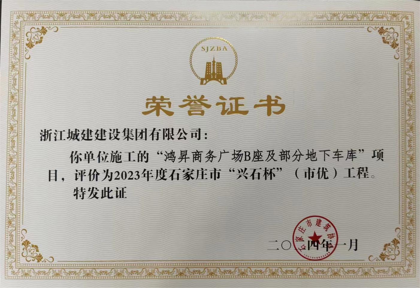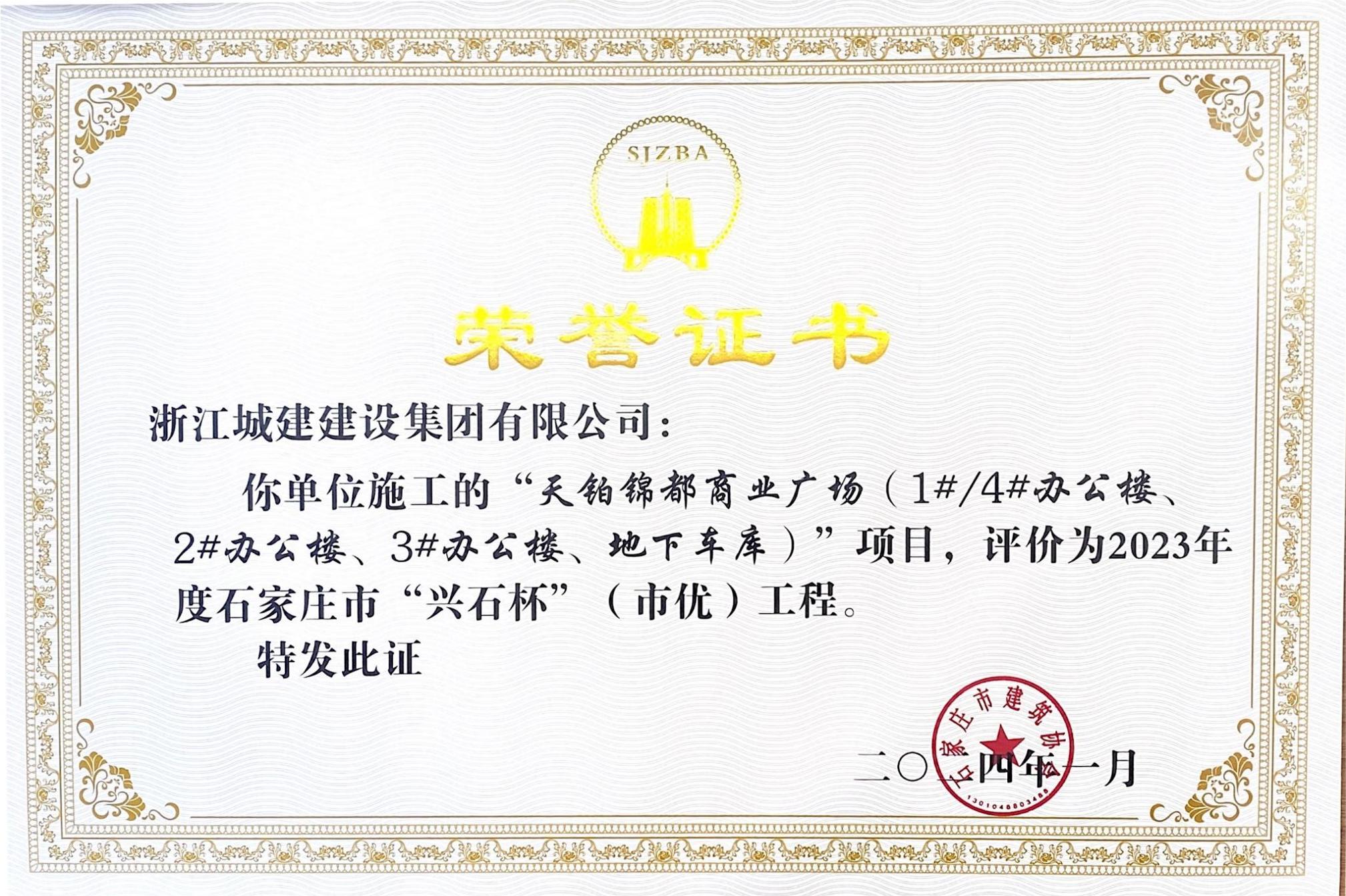 近日,從石家莊市建筑業(yè)協(xié)會(huì)傳來喜訊。由浙江城建三公司承建的“鴻昇商務(wù)廣場(chǎng)B座及部分地下車庫”、“天鉑錦都商業(yè)廣場(chǎng)1#/4#、2#、3# 辦公樓及地下車庫”兩項(xiàng)目獲得2023年度石家莊市“興石杯”(市優(yōu))工程獎(jiǎng)項(xiàng)。這一榮譽(yù)充分證明了我公司在建筑領(lǐng)域的卓越實(shí)力和穩(wěn)定高效的項(xiàng)目執(zhí)行能力。