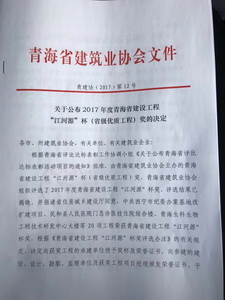 12月28日,青海省建筑業(yè)協會發(fā)文《關于公布2017年度青海省建設工程“江河源”杯(省級優(yōu)質工程)獎的決定》,我集團公司承建的青海安多藏語譯制中心工程,榜上有名,喜捧“江河源”杯。